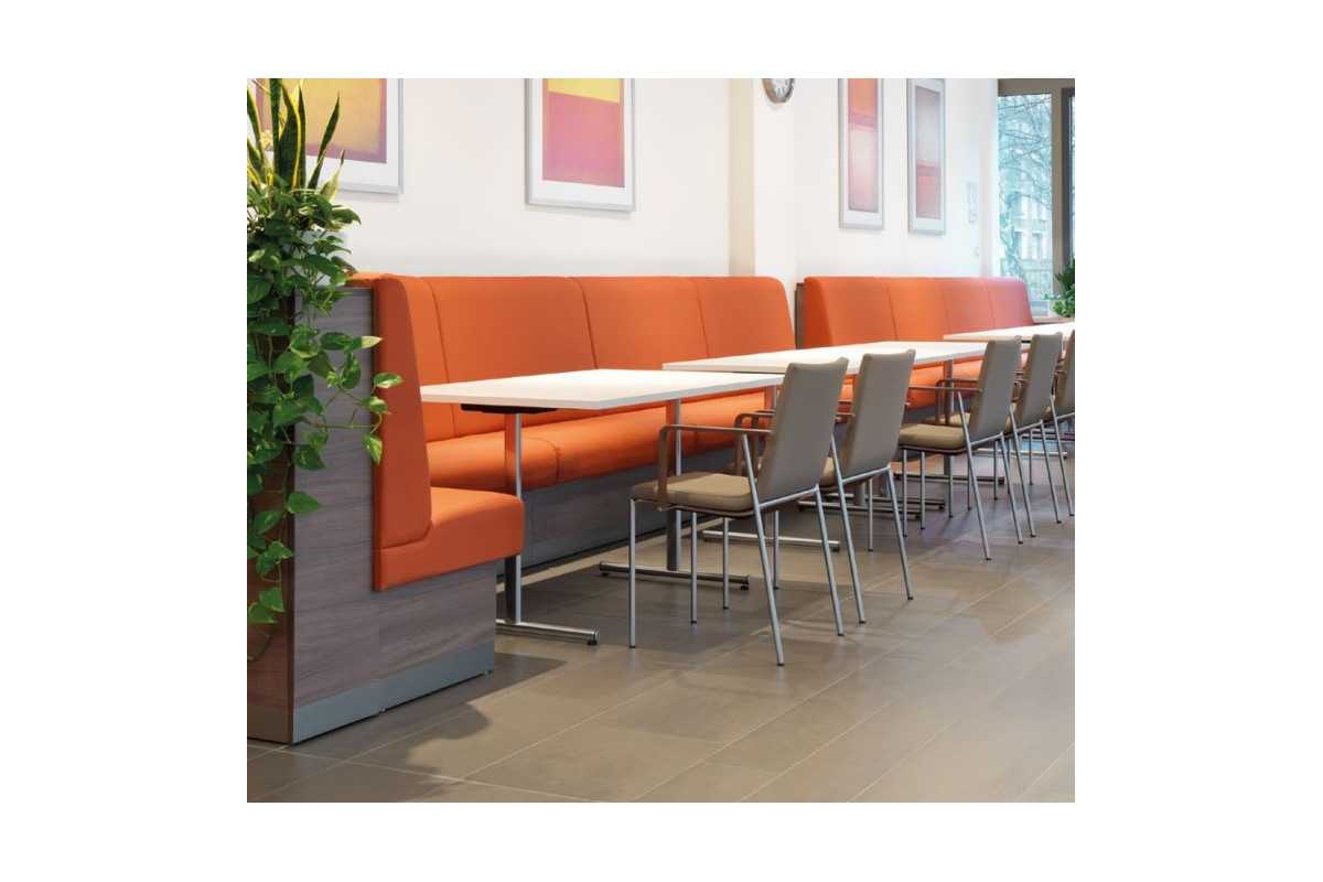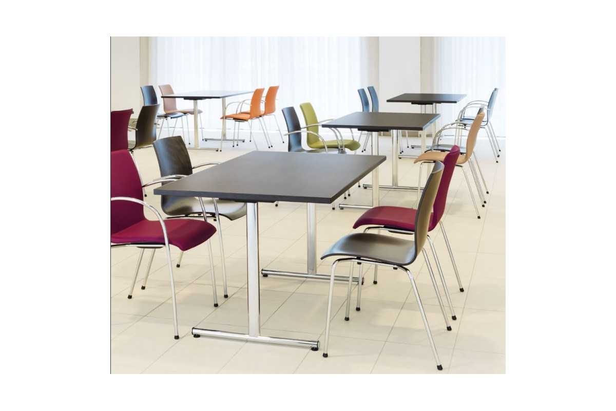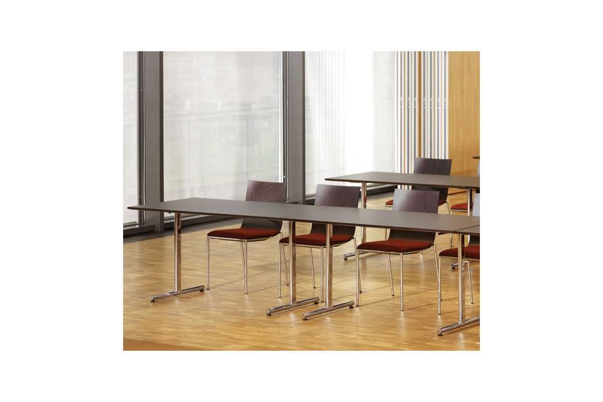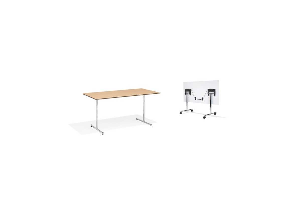 Una mesa plegable fácil de manejar y segura. El mecanismo de bloqueo patentado bloquea las patas en su sitio cuando la mesa se gira hacia arriba. Dependiendo de la variante, las mesas pueden apilarse una encima de otra con el armazón plegado o anidarse una al lado de la otra con los tableros colocados verticalmente.