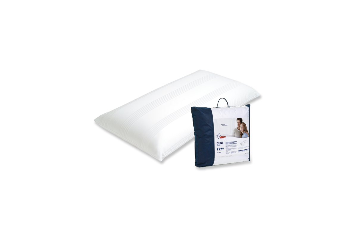 La almohada Dune está fabricada con núcleo de poliuretano viscoelástico de lenta recuperación, sensible a la temperatura y con efecto memoria. Esta almohada viscoelástica esta dentro de la gama de las almohadas de altura media alta. La almohada Dune cuenta con una funda exterior de tejido raso 100% algodón fresh sanforizado que permite la transmisión del efecto memoria del núcleo viscoelástico hacia el exterior, además de aportar un tacto muy suave y frescor.