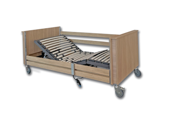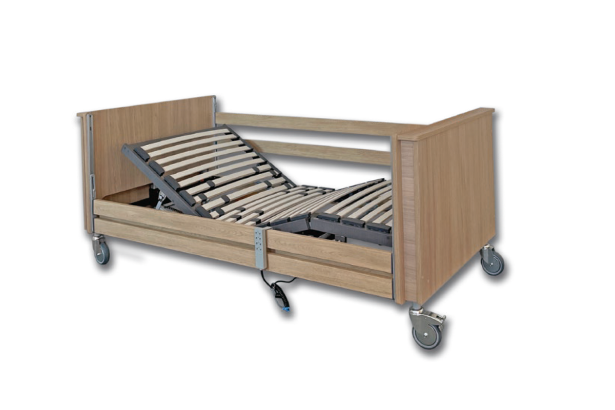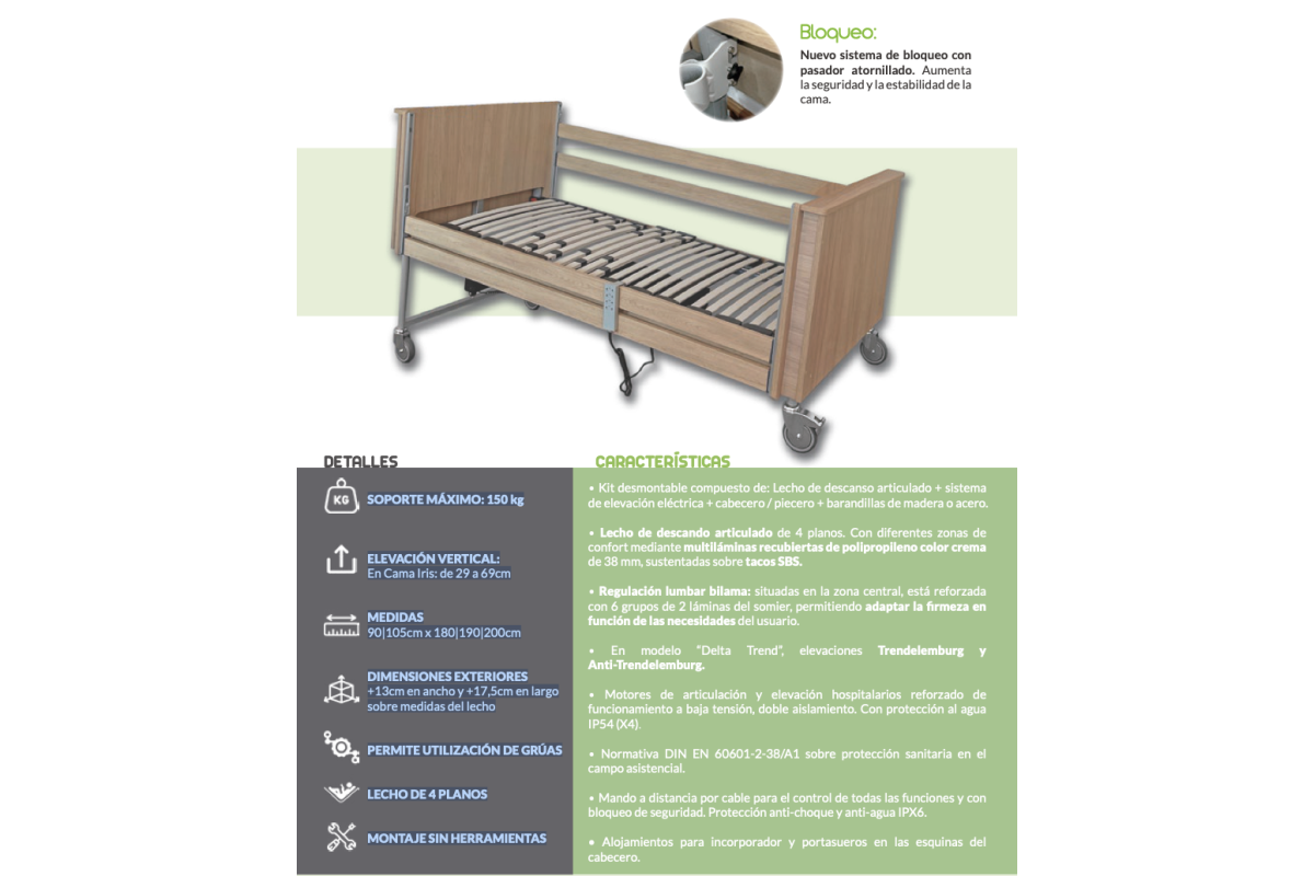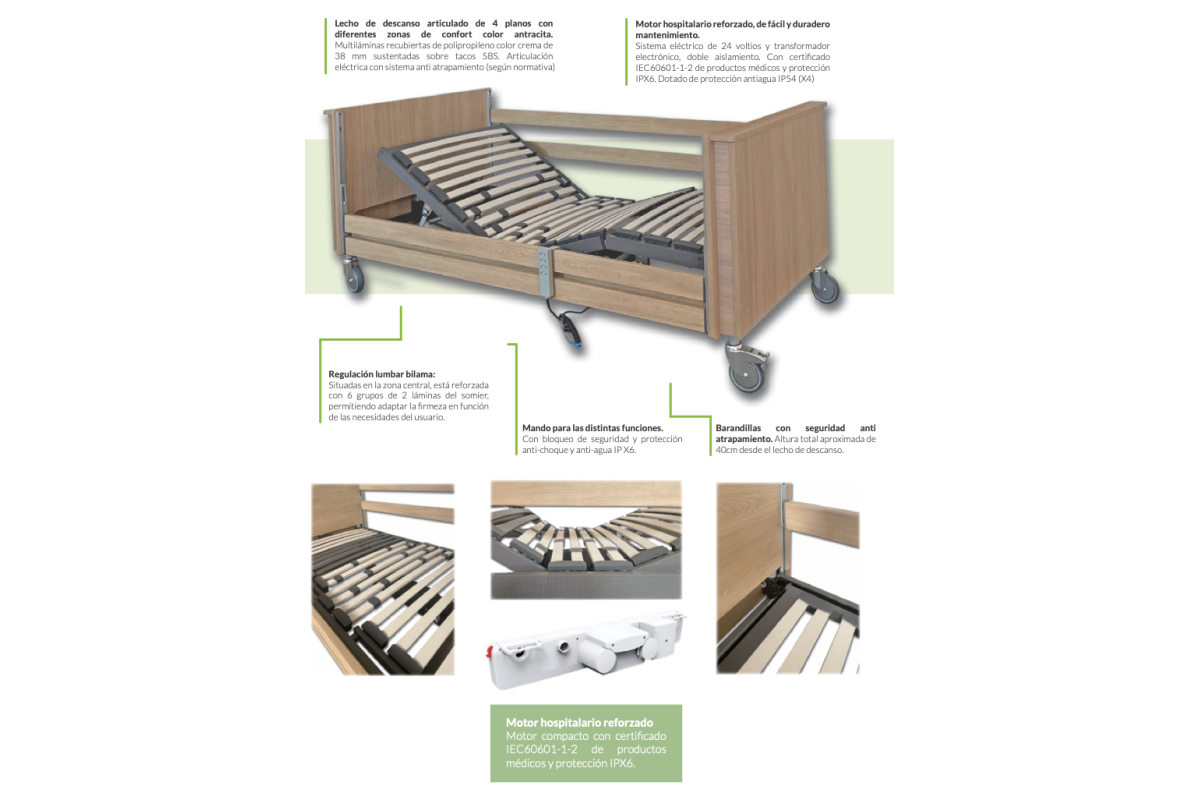 Cama articulada con sistema de 4 planos, motor hospitalario certificado, multiláminas regulables, barandillas seguras y elevación eléctrica.