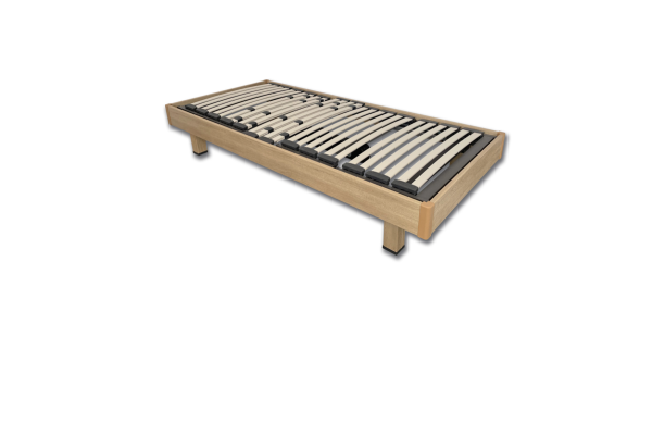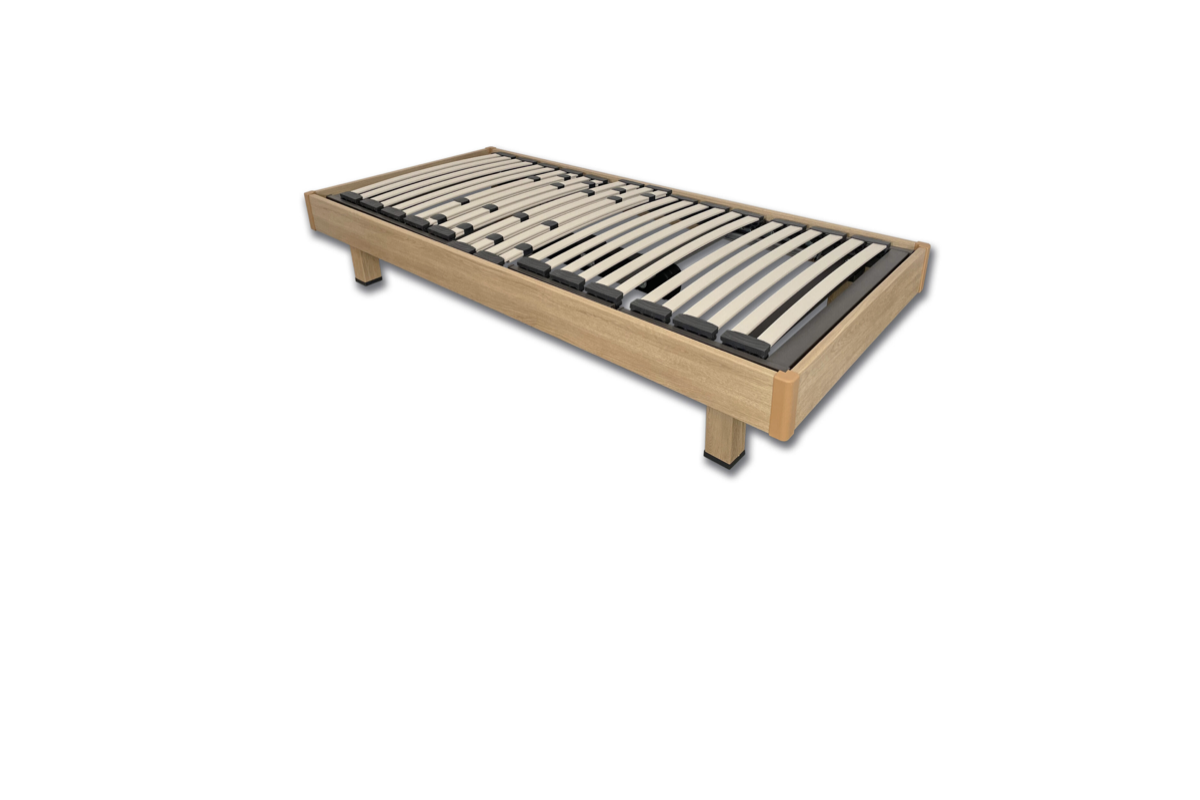 Cama fija con bastidor de madera, multiláminas sobre tacos SBS y regulación lumbar bilama. Patas cuadradas disponibles en varias alturas.