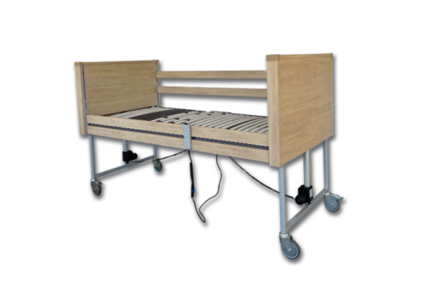 Cama articulada en madera con somier eléctrico de 4 planos, elevación vertical, regulación lumbar y barandillas seguras.