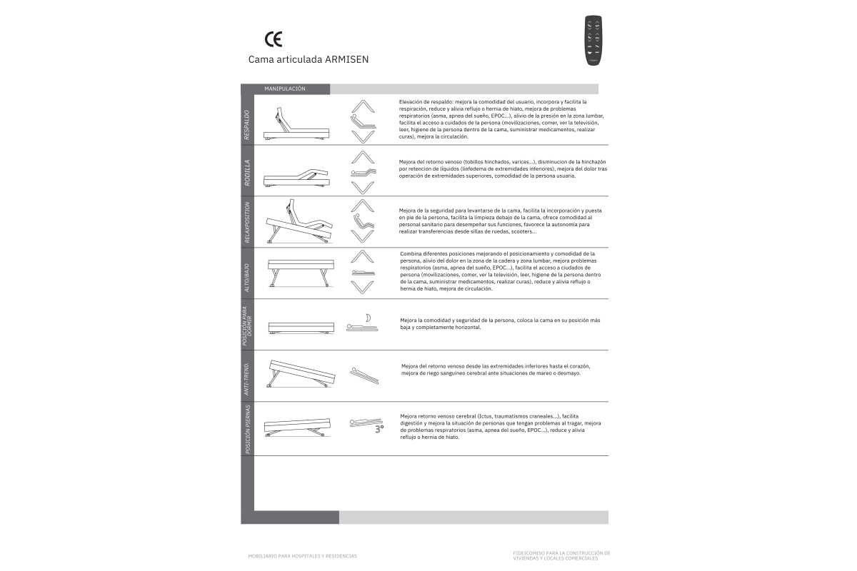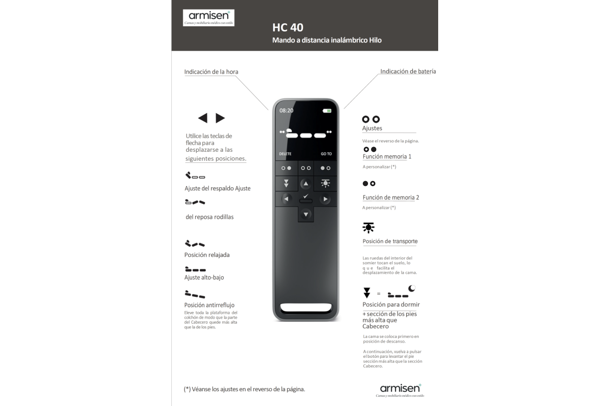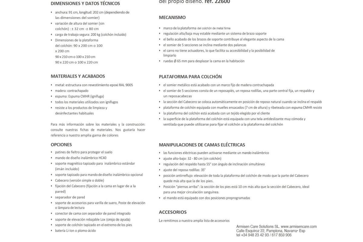 La cama ArmisenCare combina diseño elegante y funcionalidad avanzada para ofrecer el máximo confort y seguridad en el día a día. Su altura regulable eléctricamente de 32 a 80 cm permite ajustarla fácilmente sin esfuerzo, mientras que su somier articulado de 5 secciones —con reposapiésreposa-rodillaszona central fijarespaldo y reposacabezas— se adapta a las distintas necesidades del usuario. El reposacabezas inteligente acompaña de manera natural cada inclinación, ofreciendo siempre una postura cómoda y saludable. Además, incluye posiciones programablescomo lecturadescansorelajación“piernas arriba” para mejorar la circulación o la función antirreflujo, ideales tanto para el bienestar como para facilitar el trabajo de los cuidadores.