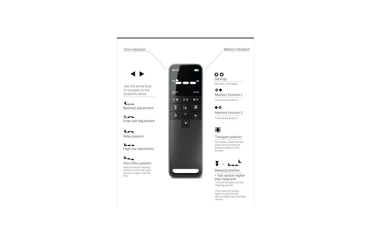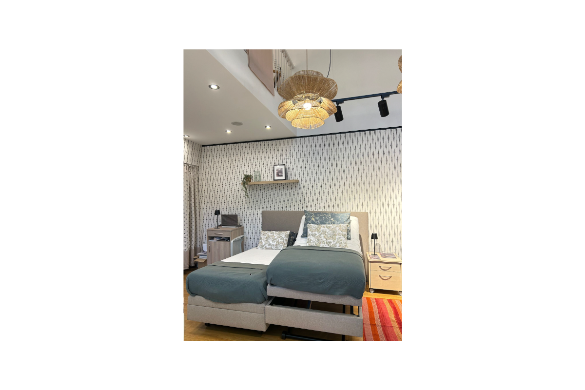 Su superficie antideslizante y ventilada asegura el colchón, mientras que la plataforma con muelles ensacados y espuma ignífuga aporta un descanso estable y seguro. Incorpora también ruedas discretas de 65 mm para un desplazamiento sencillo, soporta hasta 200 kg y se maneja con un control inalámbrico intuitivo. Todo esto con un diseño sin cables a la vista y con acabados personalizables en tejidos y colores, para que se integre perfectamente en cualquier ambiente, desde un hogar hasta un centro de cuidado.