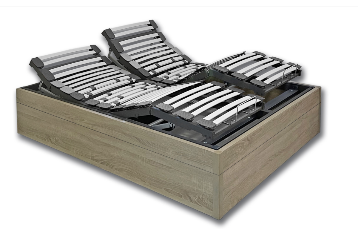 Lecho de descanso con sistema multiláminas recubiertas de polipropileno sobre tacos SBS, con regulación de firmeza en la zona lumbar.  Modelo articulado eléctrico, Mando RF sin cables con motor alemán silencioso de alta fiabilidad y durabilidad.