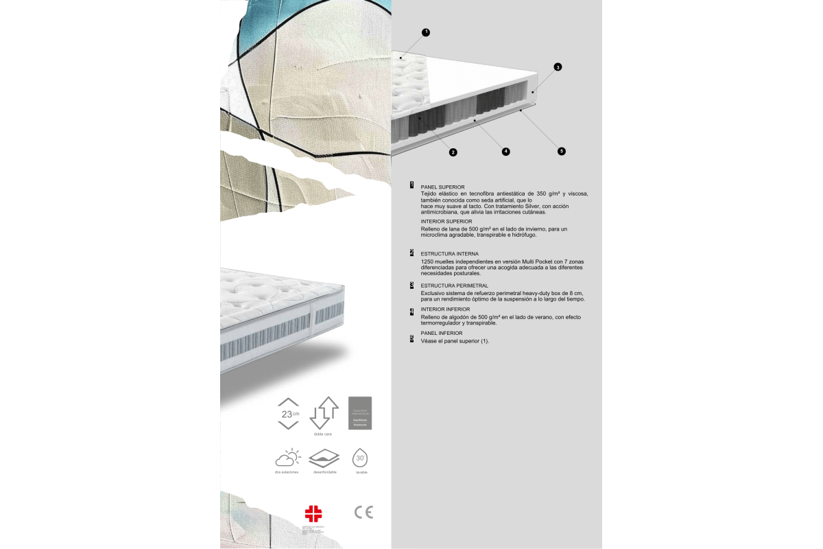 Colchón Altair: doble cara lana/algodón, tejido Silver, y 1250 muelles Multi Pocket para confort térmico, durabilidad y soporte equilibrado.