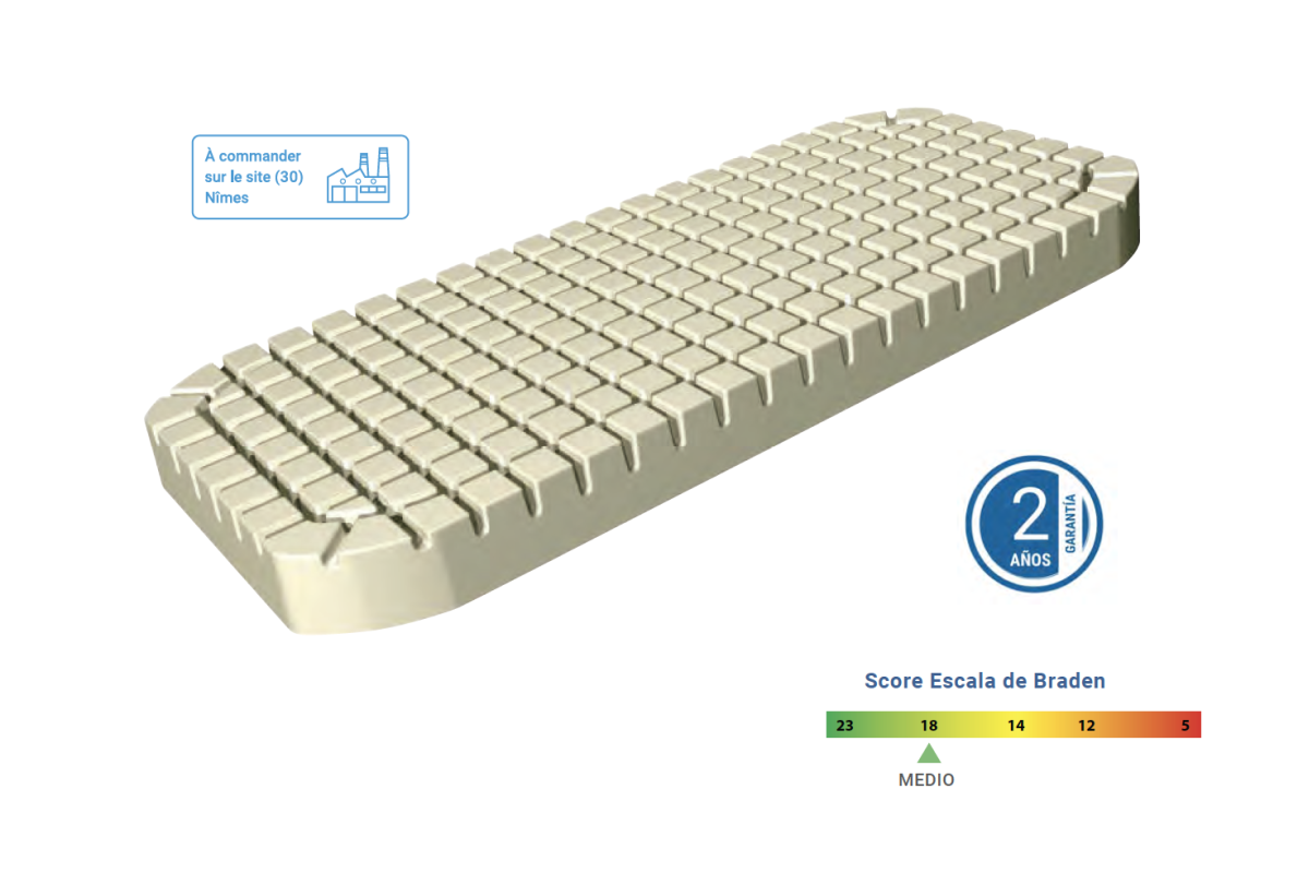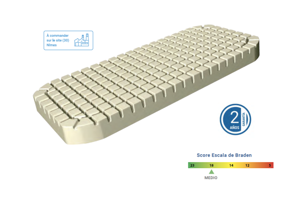 Colchón antiescaras monobloque con diseño de tacos independientes que reduce el cizallamiento, mejora la circulación y alivia la presión. Ideal para pacientes encamados de 10 a 15 horas al día con riesgo bajo o medio de UPP. Ayuda en el tratamiento de úlceras por presión de grado 1 a 2.