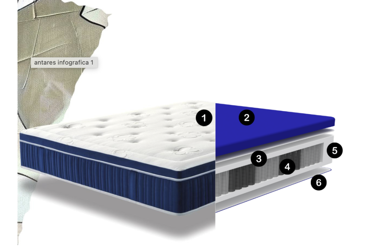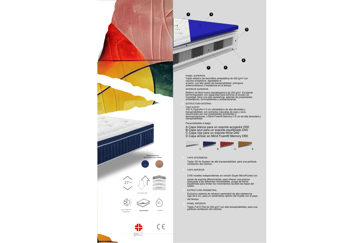 100% HydroAir h 5 cm ultraelástico de alta densidad y transpirabilidad, con extractos naturales de Soja y Coco, reconocidos por sus propiedades emolientes y dermoprotectoras o Mind Foam® Memory h 5 cm de alta densidad y transpirabilidad.