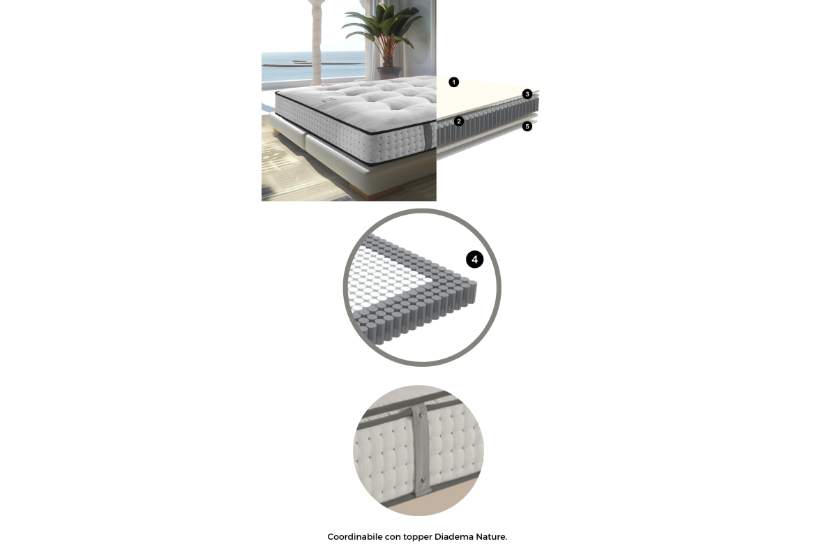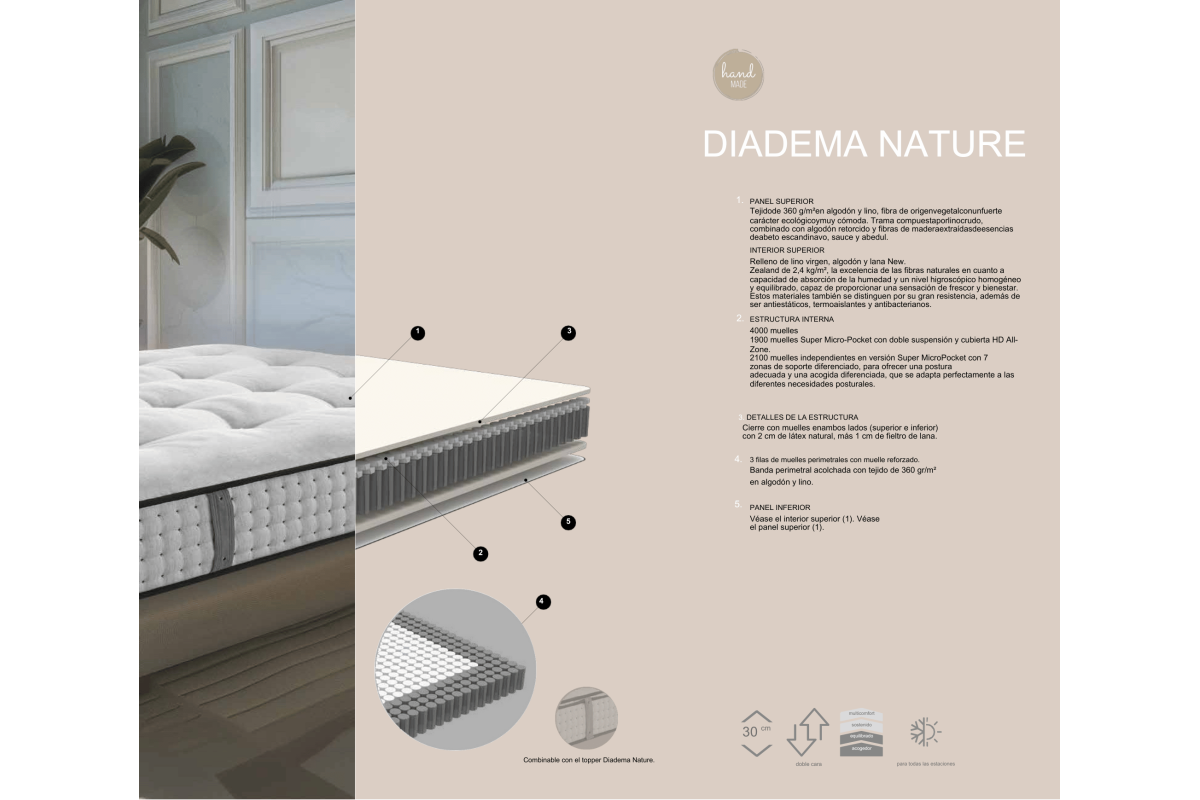 El Diadema Nature es la máxima expresión del descanso natural. Combinando una estructura de 4000 muelles Super MicroPocket con lino, lana de Nueva Zelanda y algodón, garantiza frescor, adaptabilidad y lujo natural.
