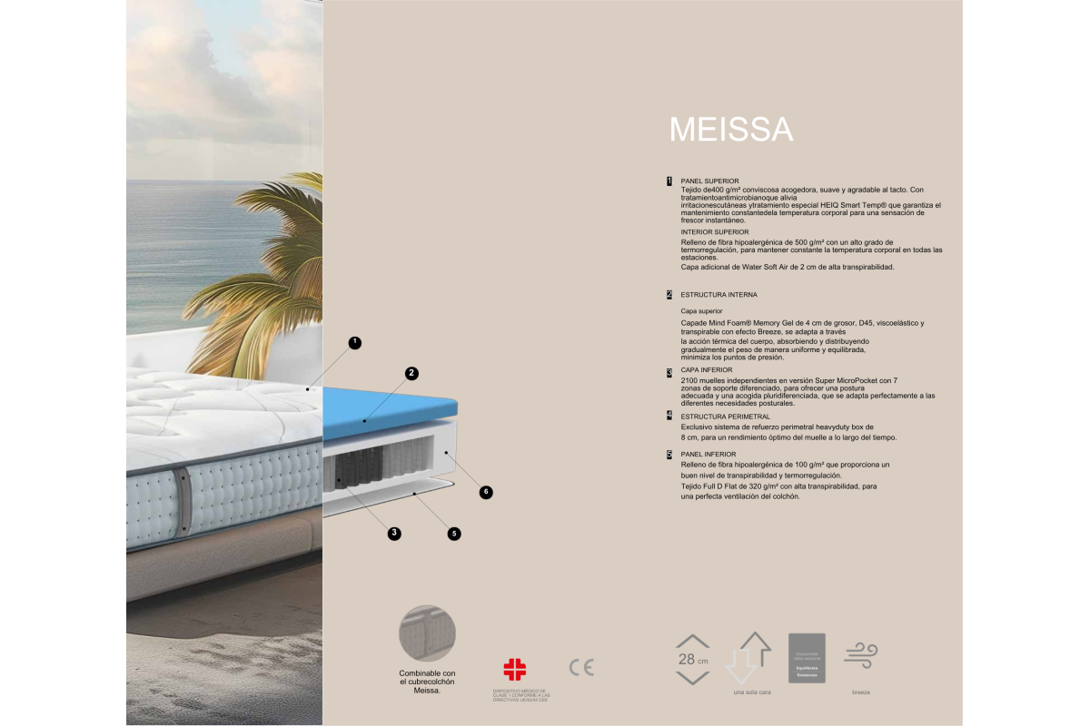 Meissa destaca por su equilibrio entre soporte y acogida. Su núcleo de 2100 muelles junto a una capa de Memory Gel aseguran una experiencia envolvente y ergonómica.