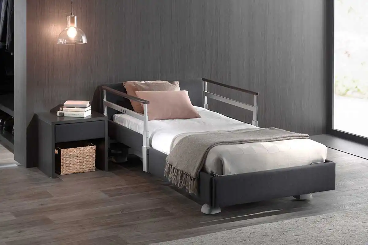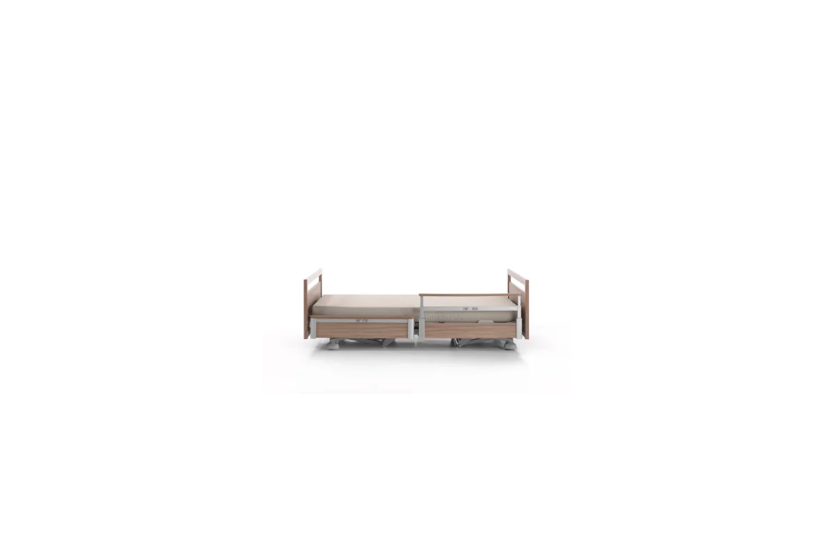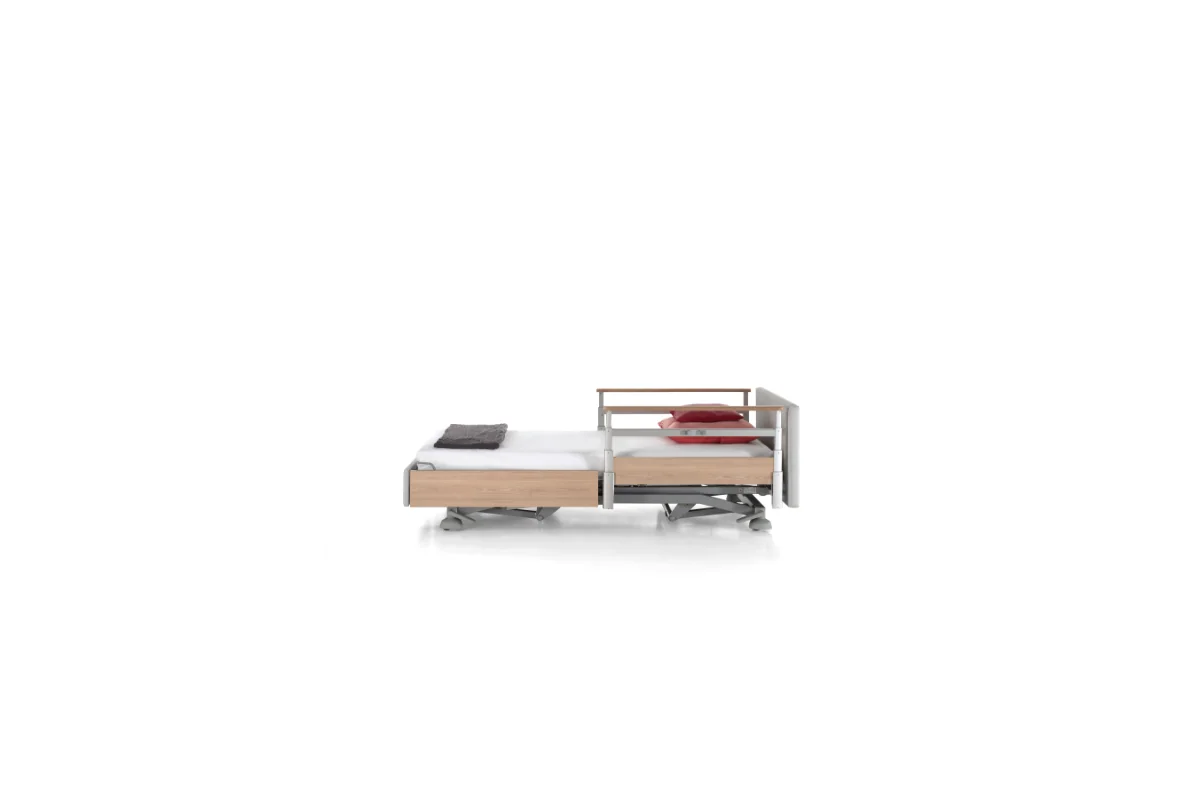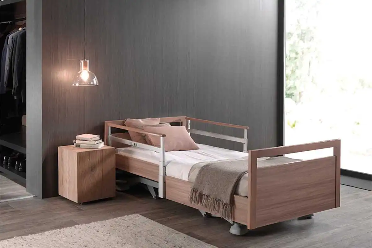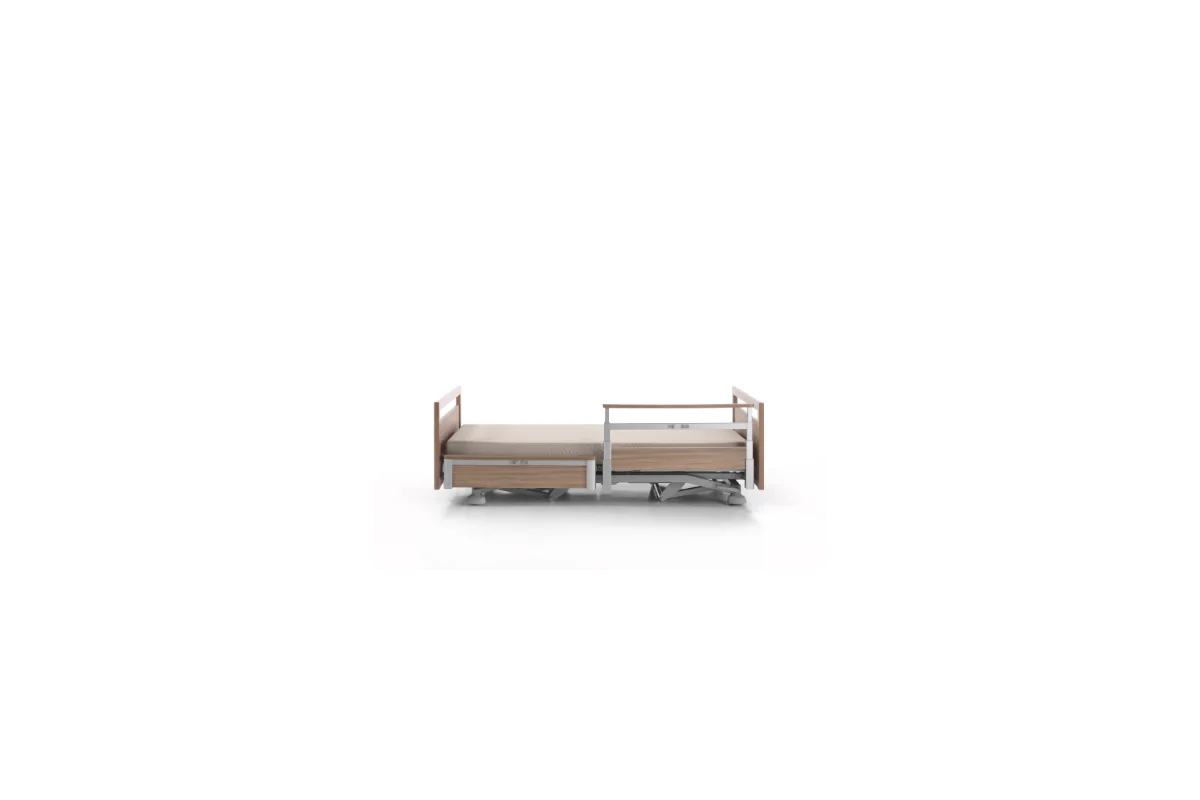 Cama asistencial baja con altura regulable de ~25 a 80 cm que combina seguridad anticaídas (posición mínima) y ergonomía para el cuidador (altura de trabajo). Estética hogareña y residencial, ruedas ocultas y opciones de barandillas/paneles para adaptar cada habitación. Carga de trabajo segura: 250 kg.