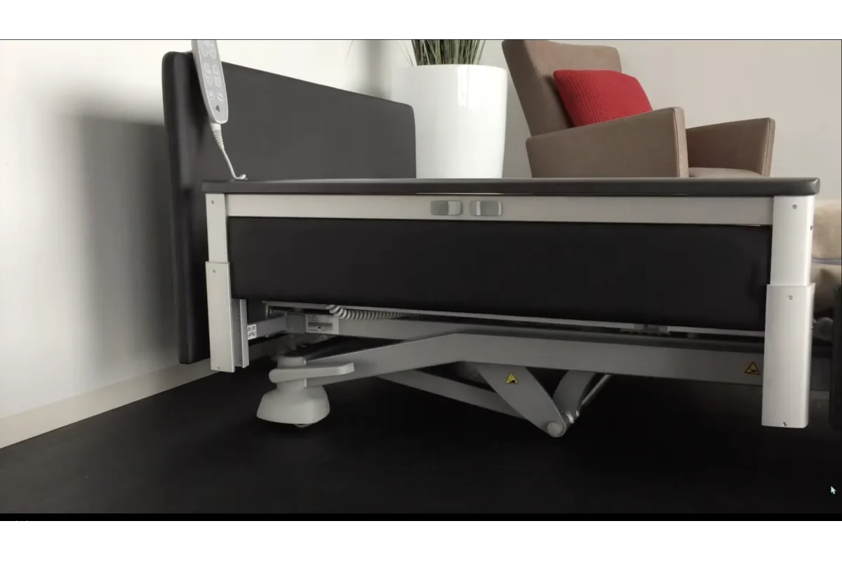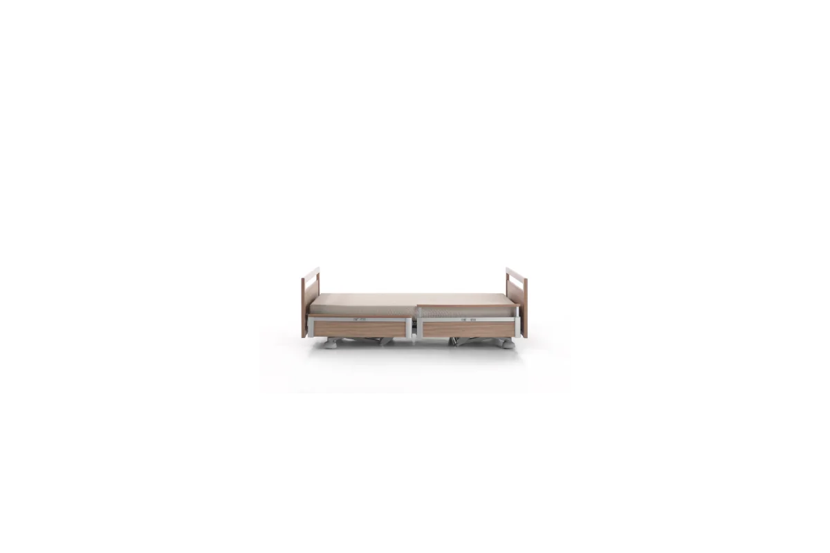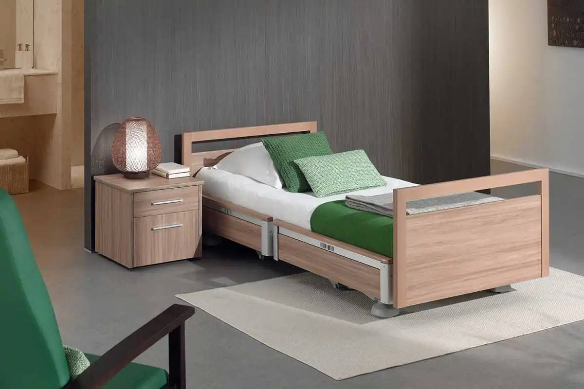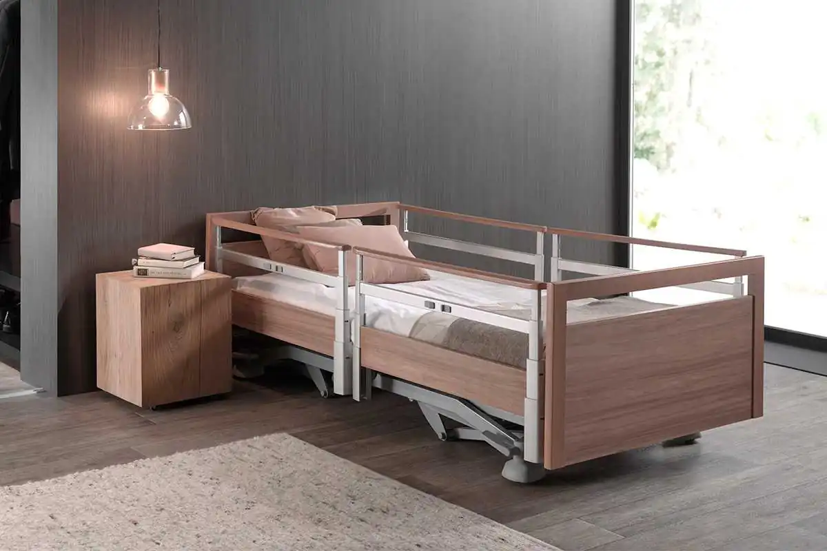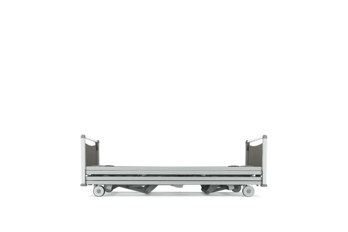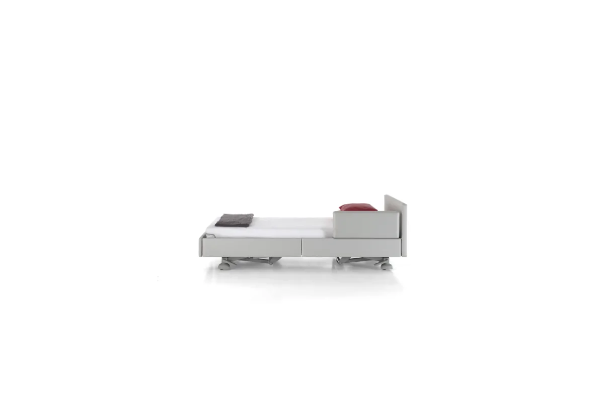 Cama asistencial baja con altura regulable de ~25 a 80 cm que combina seguridad anticaídas (posición mínima) y ergonomía para el cuidador (altura de trabajo). Estética hogareña y residencial, ruedas ocultas y opciones de barandillas/paneles para adaptar cada habitación. Carga de trabajo segura: 250 kg.