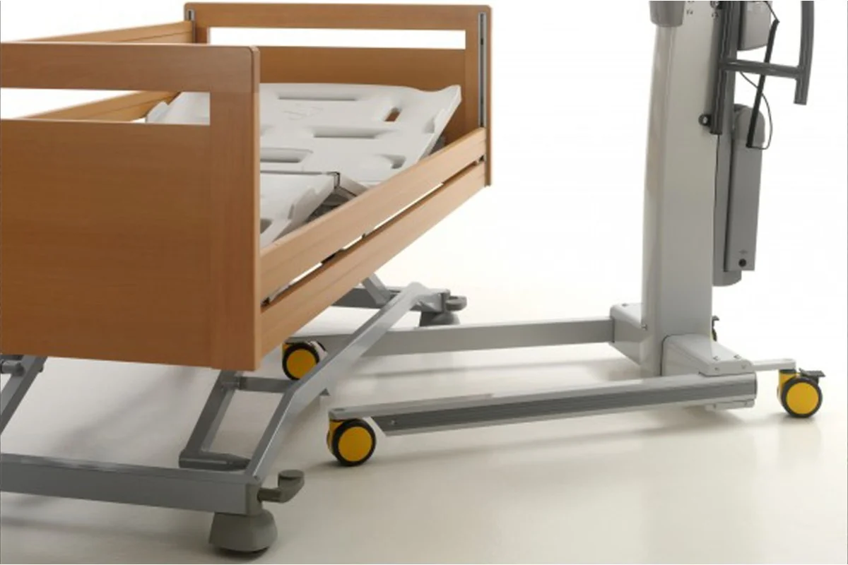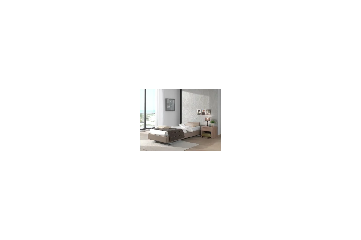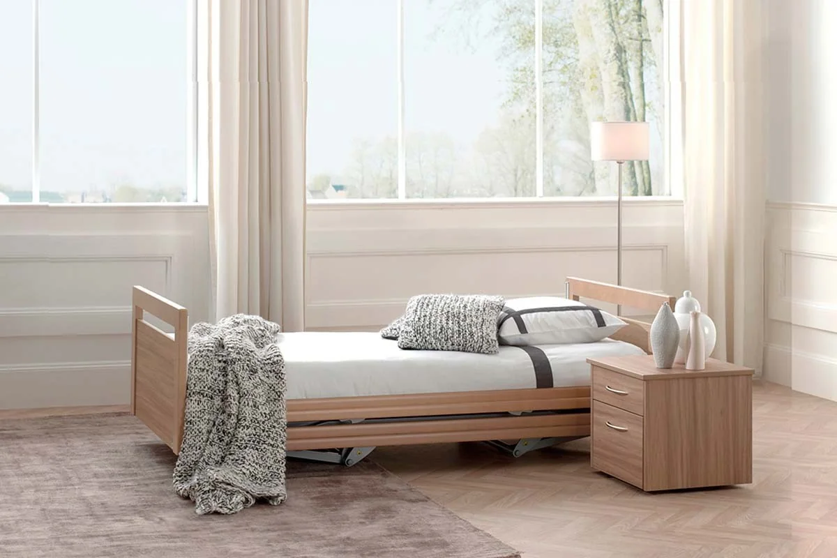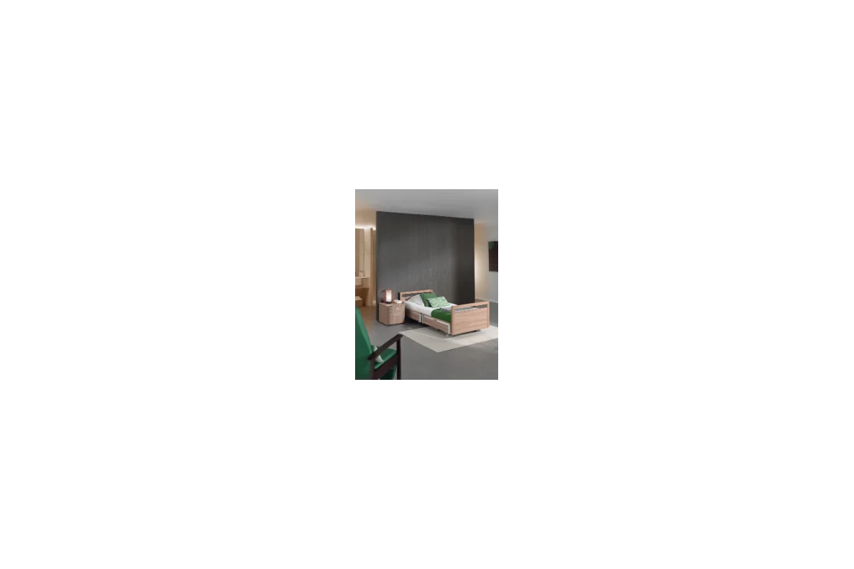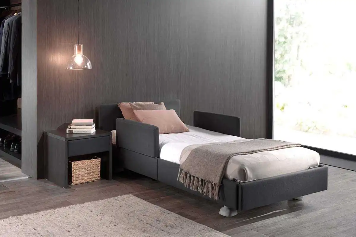 Cama asistencial baja con altura regulable de ~25 a 80 cm que combina seguridad anticaídas (posición mínima) y ergonomía para el cuidador (altura de trabajo). Estética hogareña y residencial, ruedas ocultas y opciones de barandillas/paneles para adaptar cada habitación. Carga de trabajo segura: 250 kg.