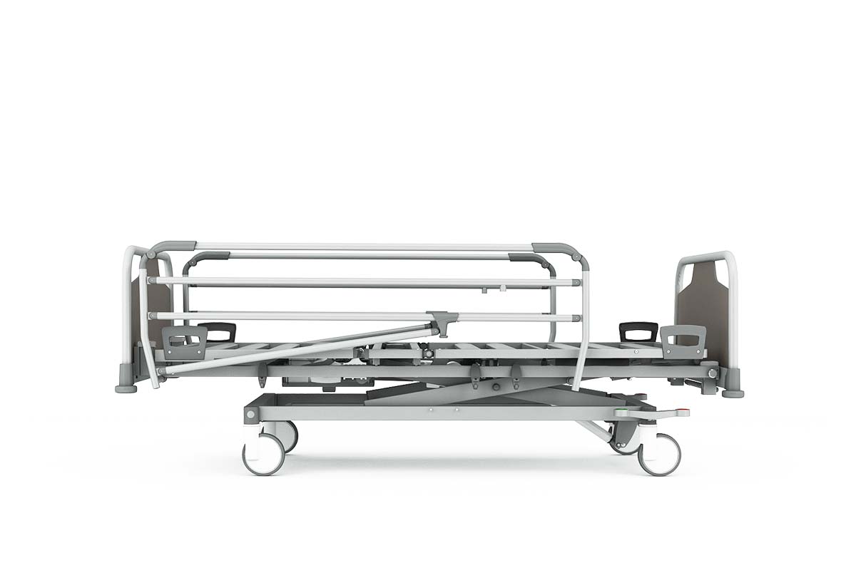 Pesa 120 kg (un 25% menos que otros modelos, traducido en menos esfuerzo al mover la cama y menos carga sobre los suelos del centro), y parte de 40,5 cm de altura mínima. Para la mayoría de pacientes hospitalizados con cognición conservada, 40,5 cm es la altura ideal: permite sentarse con los pies en el suelo al incorporarse, sin los requisitos estructurales de la ultra-baja.