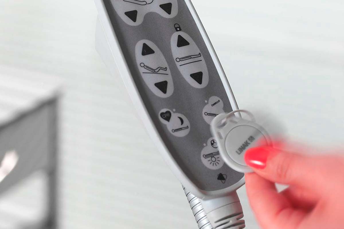 • Mando con sistema de bloqueo selectivo por llave magnética opcional: incluye todas las funciones del mando estándar más CPR, Trendelenburg y luz nocturna; bloquea funciones individuales por separado