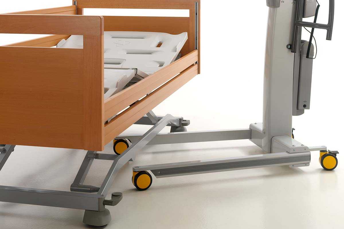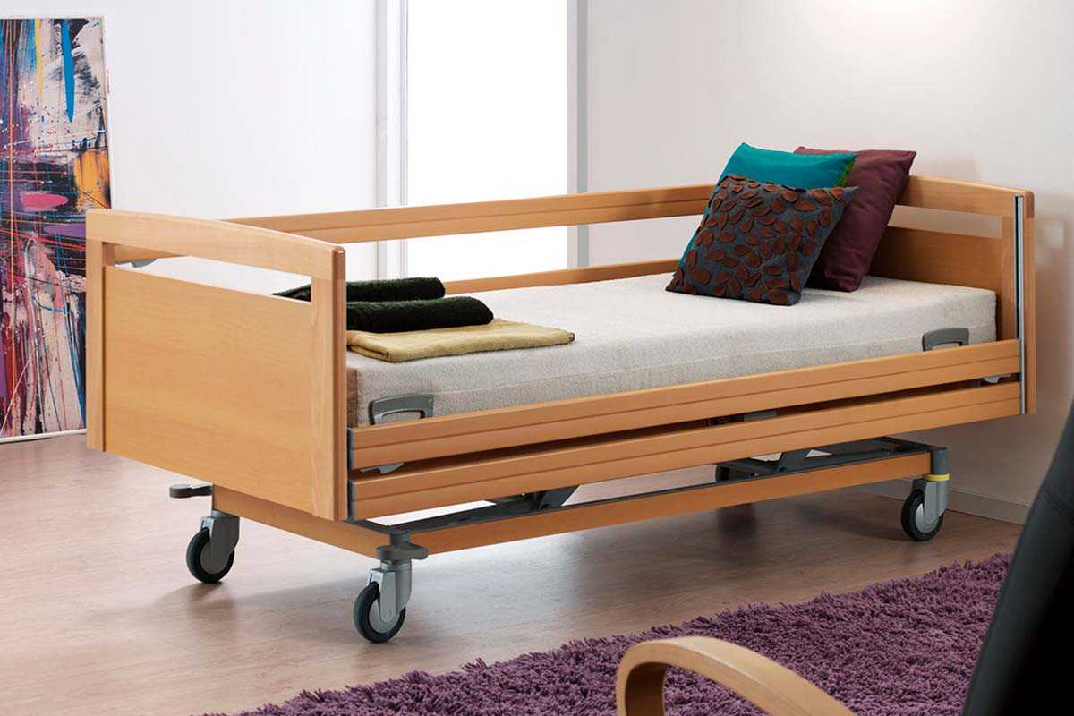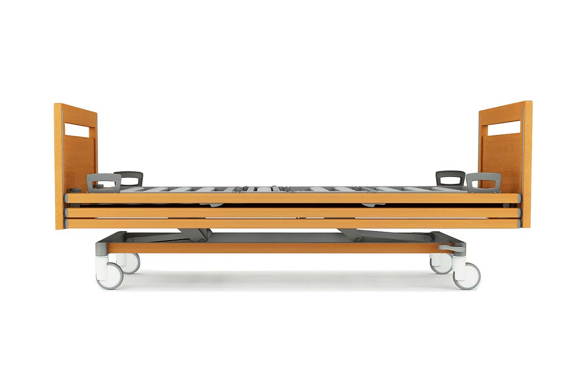 La OLYMPIA CARE es la versión domiciliaria de la cama hospitalaria Olympia, adaptada al hogar. En su configuración más completa — con paneles de haya maciza, ruedas ocultas bajo embellecedores y revestimientos de madera en el carro y el somier — se convierte en una cama doméstica que nadie identificaría como cama asistencial.