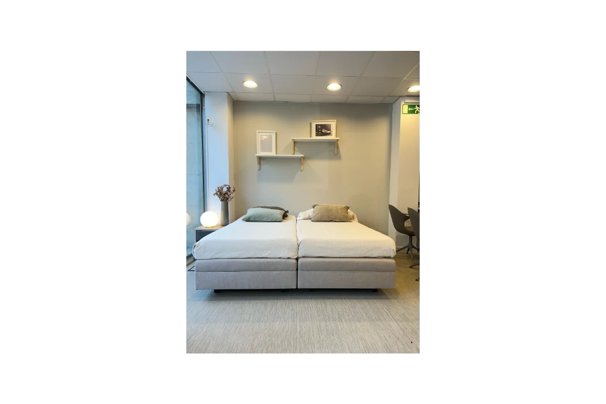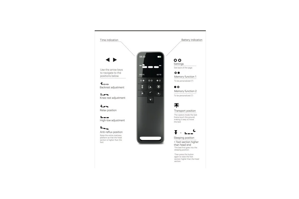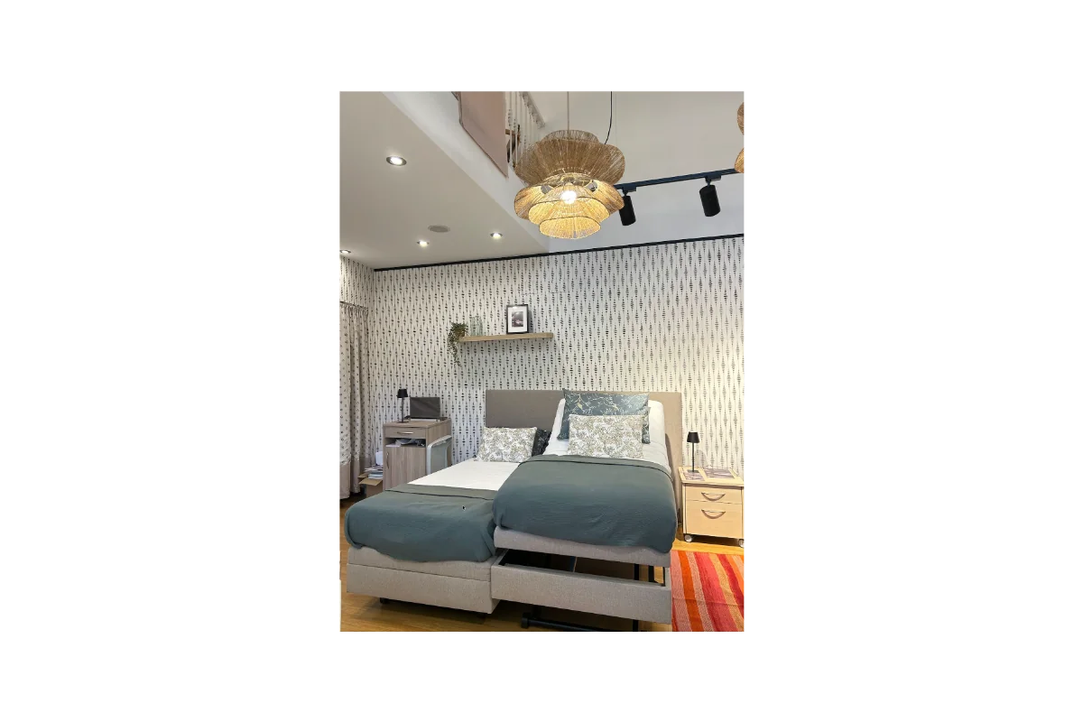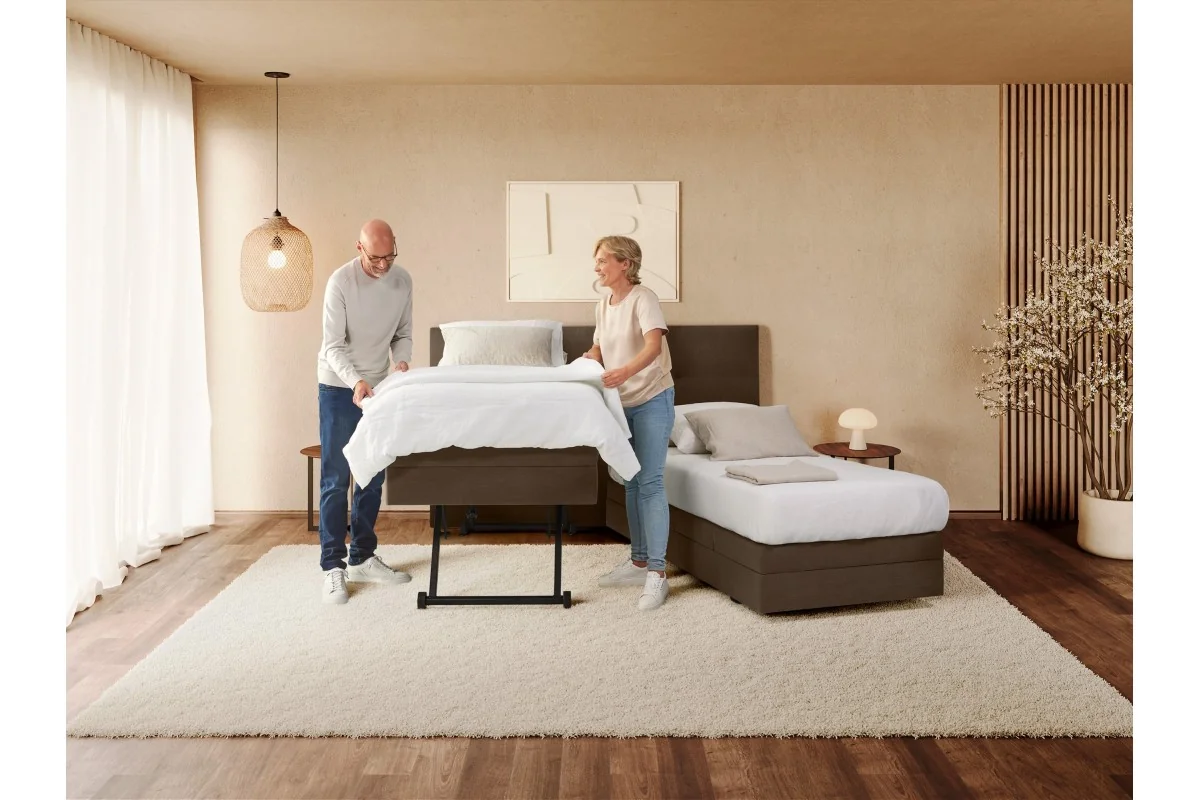 Su superficie antideslizante y ventilada asegura el colchón, mientras que la plataforma con muelles ensacados y espuma ignífuga aporta un descanso estable y seguro. Incorpora también ruedas discretas de 65 mm para un desplazamiento sencillo, soporta hasta 200 kg y se maneja con un control inalámbrico intuitivo. Todo esto con un diseño sin cables a la vista y con acabados personalizables en tejidos y colores, para que se integre perfectamente en cualquier ambiente, desde un hogar hasta un centro de cuidado.