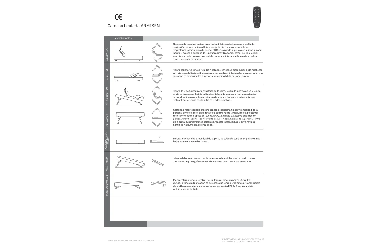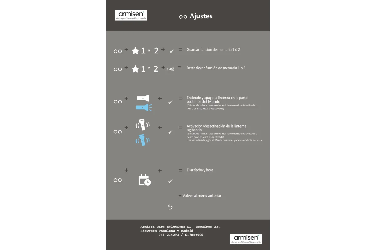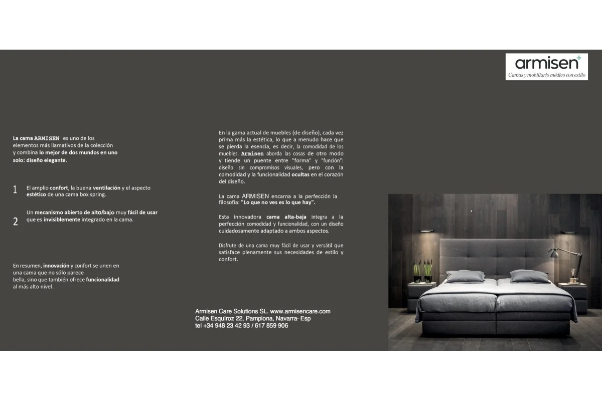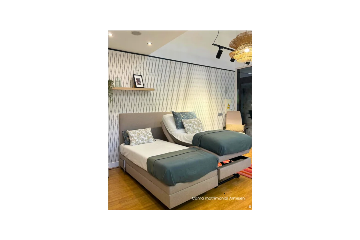 La cama ArmisenCare combina diseño elegante y funcionalidad avanzada para ofrecer el máximo confort y seguridad en el día a día. Su altura regulable eléctricamente de 32 a 80 cm permite ajustarla fácilmente sin esfuerzo, mientras que su somier articulado de 5 secciones —con reposapiés, reposa-rodillas, zona central fija, respaldo y reposacabezas— se adapta a las distintas necesidades del usuario. El reposacabezas inteligente acompaña de manera natural cada inclinación, ofreciendo siempre una postura cómoda y saludable. Además, incluye posiciones programablescomo lectura, descanso, relajación, “piernas arriba” para mejorar la circulación o la función antirreflujo, ideales tanto para el bienestar como para facilitar el trabajo de los cuidadores.