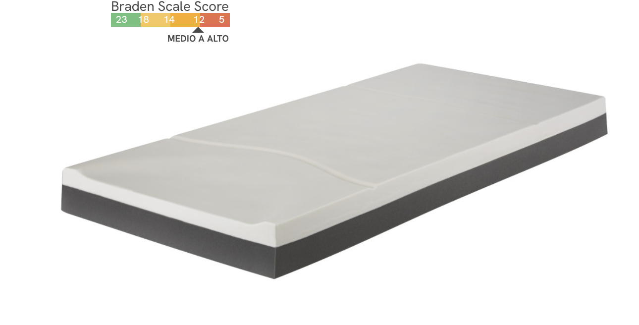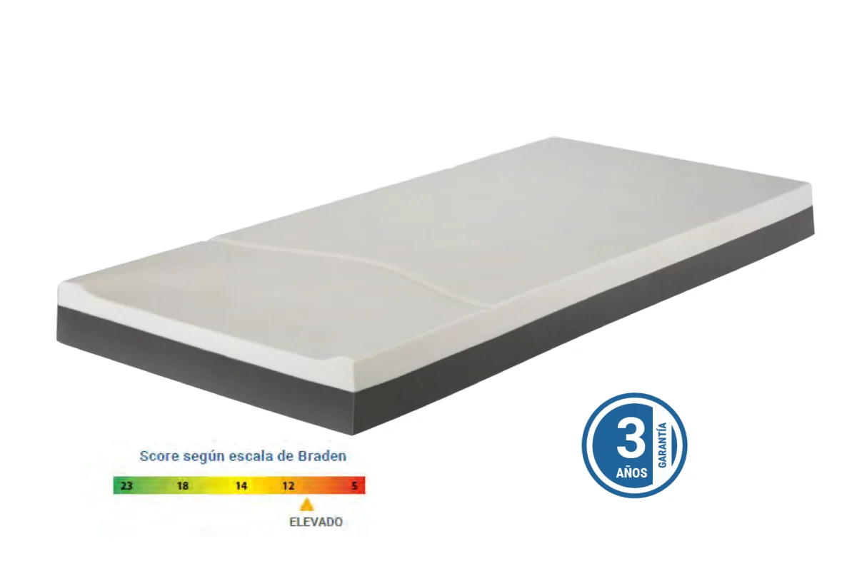 Colchón antiescaras VITA FORM 4 con espuma viscoelástica y base HR. Previene y trata UPP grado 1-2 en pacientes con riesgo medio a elevado. Diseño ergonómico multizona, adaptable a la cama y a la morfología del paciente. Reduce la presión en zonas críticas como talones y sacro.