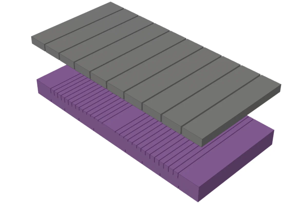 - 7 cm de viscoelástica con partículas de grafeno (60 kg/m³): efecto memoria y disipación térmica.
